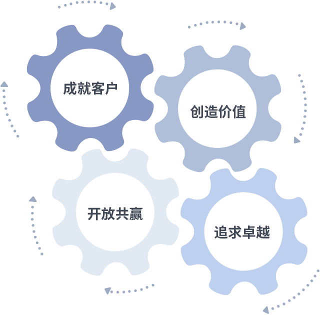 成就客户是一切决策的出发点,,创造价值是衡量所有工作的标准,,,,追求卓越是我们做事做人的态度,,,,开放共赢是我们的格局也是最终的结果。。。。价值观的齿轮环环相扣,,推动着组织里的每个人不断向前。。。。