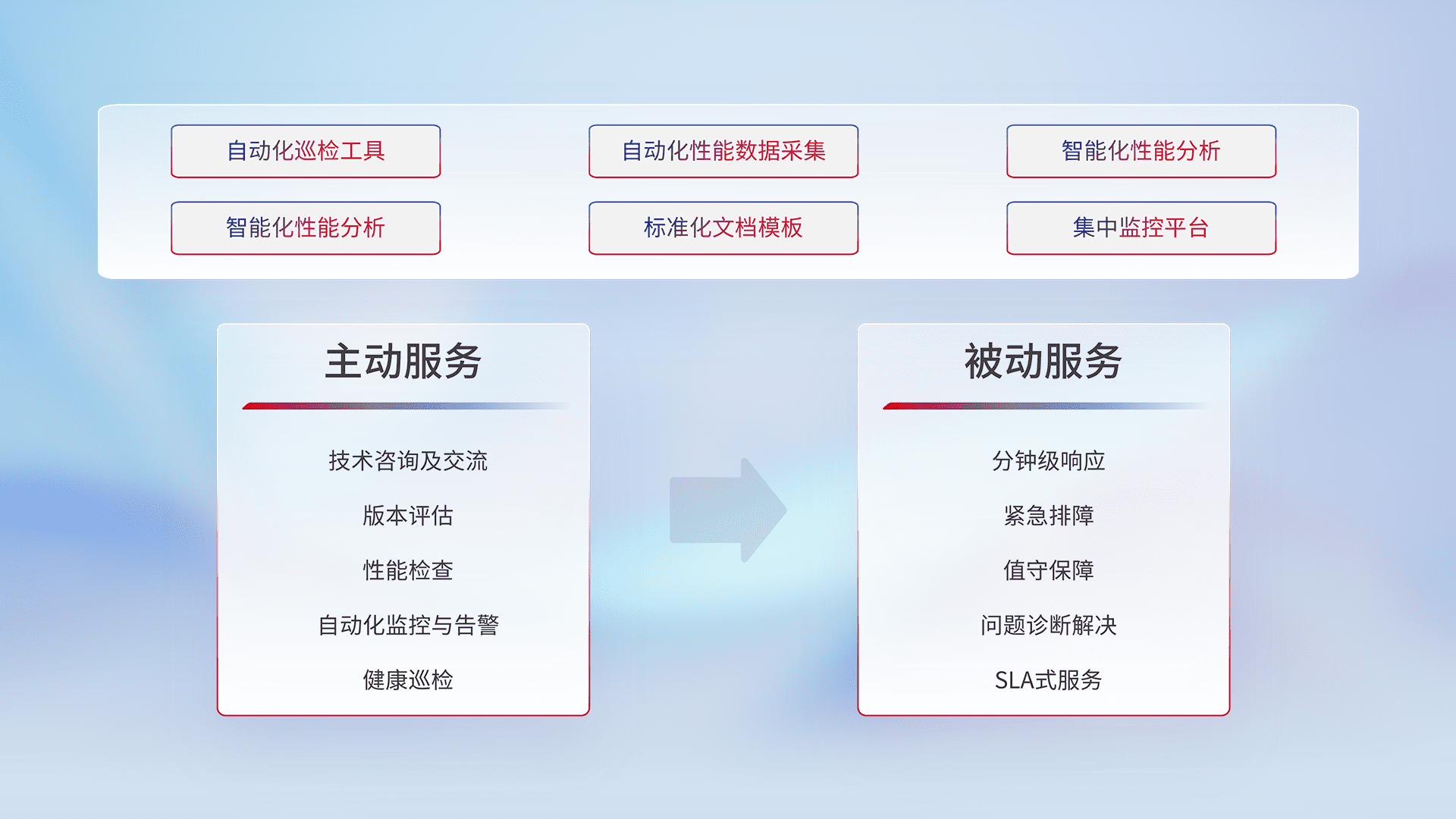 智能化工具和标准化文档,,,保障服务质量,,提供主动服务(包含技术咨询、、、、版本评估、、、、性能检查、、自动化监控与告警、、、、健康巡检)和被动服务包含(分钟级响应、、紧急排障、、、值守保障、、、、问题诊断解决、、SLA服务)。。。